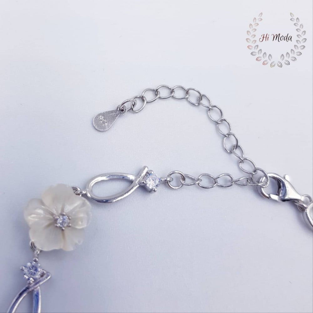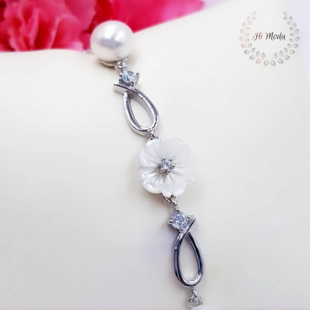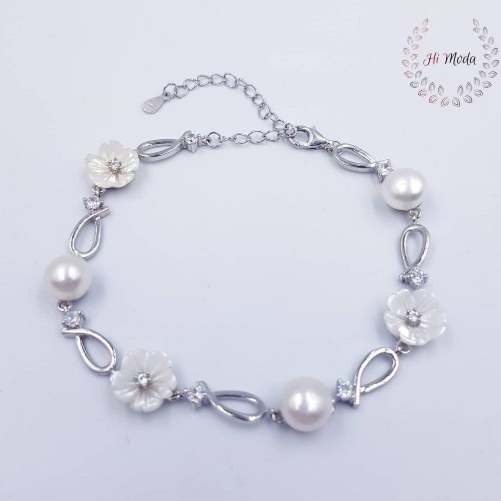 اسورة من الفضة عيار 925، مزينة بحبات من اللؤلؤ الزراعي الرائع وورود الصدف الأنيقة. 💎
